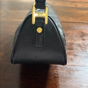 •Adorned with a central logo plate and several smaller gold logo motifs/studs along the bottom of the bag
