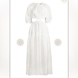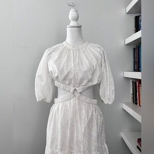 A key highlight of the collection - the Skyler Dress in white is a stand-out. Crafted from an elegant fabrication, featuring cut-out detail at the waist, accentuated sleeves, and elastic waist and backing. To polish off this classic style, add an open-toe heel and simple gold jewelry.