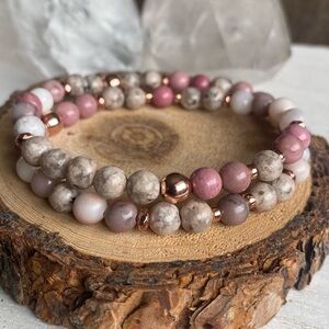 This oh so pretty gemstone wrap bracelet features the soft hues of pink of Rhodocrosite, lavender Jasper and a pretty speckled feldspar. Complimented with rose gold hematite accents this bracelet adds a soft, pretty feminine touch.
