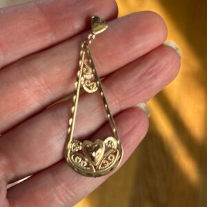 Beautiful vintage 14k SOLID GOLD lavaliere pendant. This beauty is 2” long, filled with diamond cuts to make it shine and the bail is a heart! The bail on the bottom is puffy, the cutouts and filigree work is stunning. Seriously gorgeous pendant with great details. Perfect pristine condition. Stamped 14k.