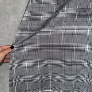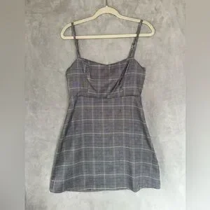 Stylish mini dress with white black and charcoal plaid. Features thin straps and a fitted silhouette. Perfect for casual wear.