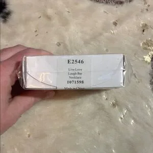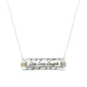 Silver necklace with gold and silver pendant reading Live Love Laugh.