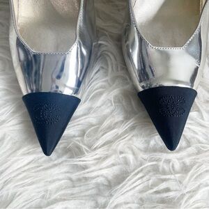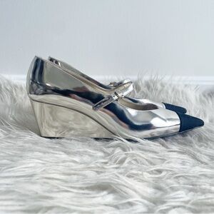 Chanel laminated calfskin metallic gold (light gold, looks almost silver) wedges with a pointed toe. Signature CC interlocking logo. From the 2022 collection.