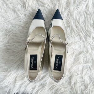 Chanel Interlocking CC Logo Metallic Mary Jane Wedge Pump Gold Black Pointed Toe