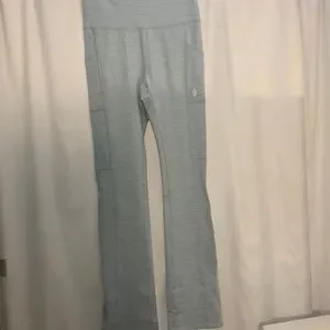 Perfect for your next practice, these yoga-ready flares feature a high-rise fit and heathered fabrication with side-pocket detailing. *Fit:* High-rise, full-length *Features:* Soft heathered fabrication, wide elastic waistband, side pockets at thighs, flared bottom hem with side-slit detailing, four-way stretch, breathable design *Why We <3 It:* Made for low-impact activities and every day wear, these flares can be worn with the waistband rolled up or down.