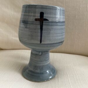 Design: A round, handcrafted stoneware goblet featuring a blue cross design.