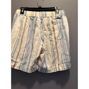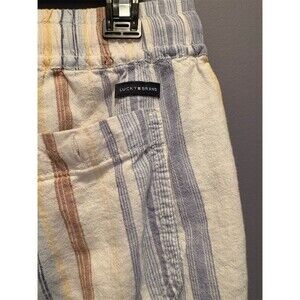 Keywords: Lucky Brand, women’s sleep shorts, lounge shorts, size small, S, linen blend, striped shorts, cream tan blue, drawstring waist, elastic waist, breathable, pull on shorts, pajama shorts, pockets, sleepwear