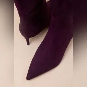 NWOT Eggplant Suede Pointed-Toe Over-the-Knee Boots. Size 9. Fits TTS. About 2.5” heel.