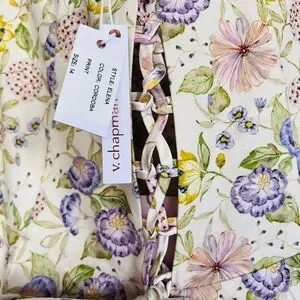 Elegant cream dress with vibrant floral design. Features purple and green flowers. Perfect for any occasion. Linen. Fits like a dream.