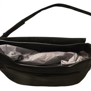 Rag & Bone classic black leather saddle bag crafted from supple, high-quality leather with a structured yet soft silhouette. Features a magnetic flap closure and silver-tone hardware for a sleek, modern finish. Also has two zipper pockets and one outer magnetic pocket on the back for easy storage.
