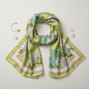 Elegant floral scarf, green white accessory, satin finish scarf, lightweight summer wrap, refined chic style, polished everyday accessory, botanical print scarf, travel friendly fashion, versatile styling piece, minimalist elegance, casual luxury look, timeless floral design, elevated summer accessory, giftable fashion item