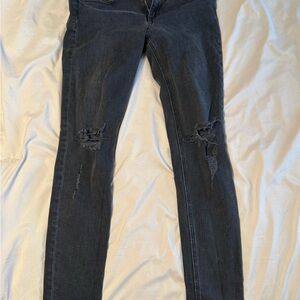 Chic black skinny jeans with stylish rips. Perfect for a modern look.