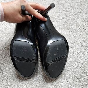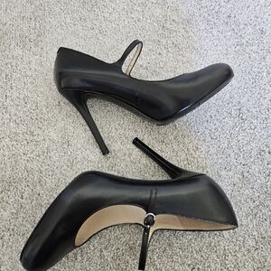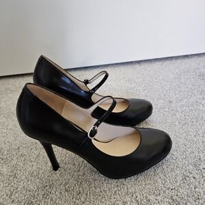 The Nine West Msknoitall is a black, Mary Jane style stiletto platform pump with about a 4 inch heel and about a 1/2 inch front platform.