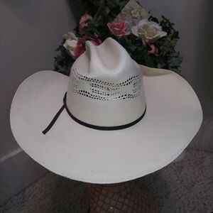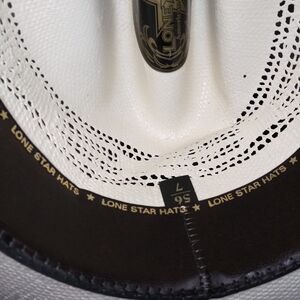 Nice unisex ivory cowboy hat in a laminated stiff straw with black grosgrain headband, from Lone Star Hats. Hat is in like new condition, except for the brim is bent up on the left side, and straw is creased (please see photo). Hat has size 56/7 on inside brim. It's inside circumference is 21 3/8 inches. Please see all photos, always accepting reasonable offers.