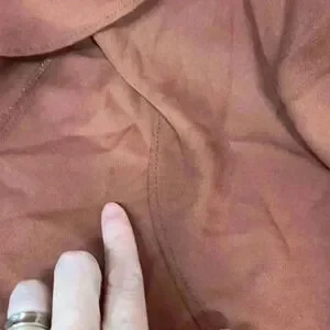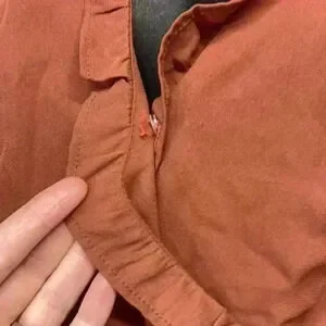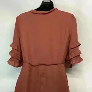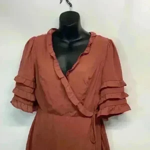 June and Hudson size medium rust colored wrap dress ruffle sleeves wraparound tie some spots on the bottom button on the chest for a closure