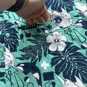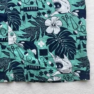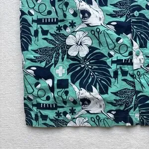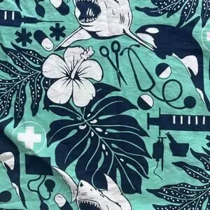 Rum Reggae short sleeve button down shirt features a unique medical-themed tropical print. The teal cotton fabric is covered in a detailed pattern of sharks, orcas, hibiscus flowers, and monstera leaves interspersed with stethoscopes, syringes, pills, and medical crosses. This lightweight shirt includes a single chest pocket and a classic point collar, perfect for healthcare professionals looking for a fun summer style.