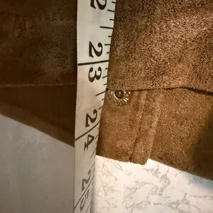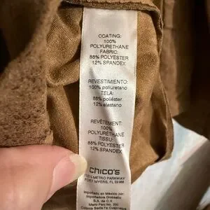 Stylish tan leather jacket by Chico's. Features gold button details and zippered pockets. Ideal for versatile wear. Chico’s Sz 2, equals 12/14.