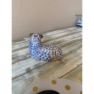 Royal Crown Derby Imari paperweights featuring a seated ram and a lamb, both finished in the distinctive blue, white, and 22K gold Imari pattern.