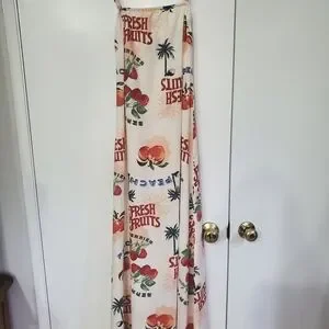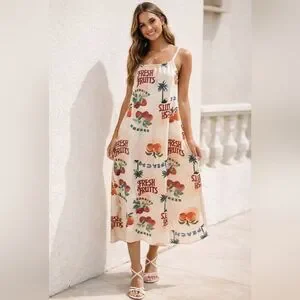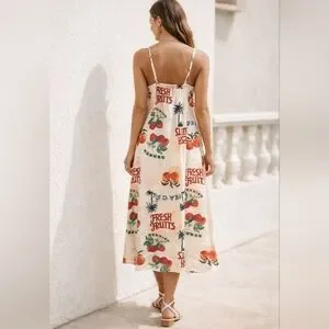 Turn heads in this playful fruit-print midi dress featuring a breezy silhouette and lightweight fabric perfect for warm days. The delicate spaghetti straps and relaxed fit make it effortlessly comfortable while still looking chic. Whether you're heading to brunch, vacation, or a summer event, this dress brings bright, happy energy to any outfit.