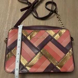 Chic crossbody with pink and gold foil accents. Eye-catching design. Ideal for day or night.