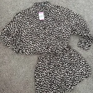 Stylish leopard print pajama set. Button-up top with matching shorts. Comfortable and chic.