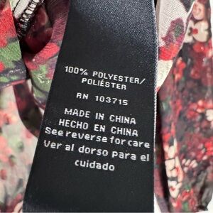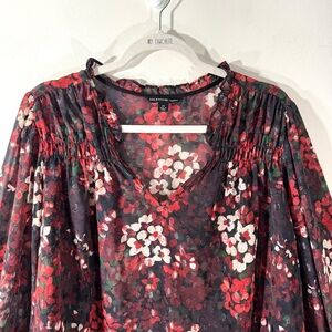Zac & Rachel sheer floral blouse with a red, black, and white design and balloon sleeves