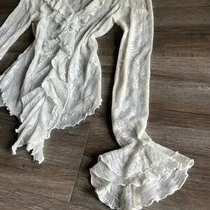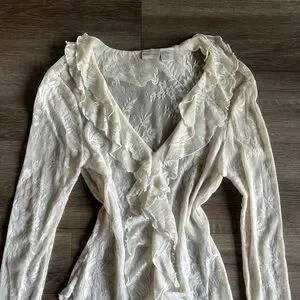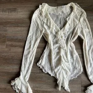 Chic cream lace blouse with ruffled edges. Long sleeves and v-neck design. Perfect for elegant occasions.
