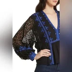 Fall in love with this retro blouse featuring delicate embroidery and billowy lace sleeves that will always lighten the mood and your look.