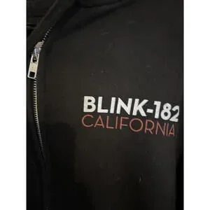 Black zip-up hoodie featuring Blink-182 California logo on the front left chest.