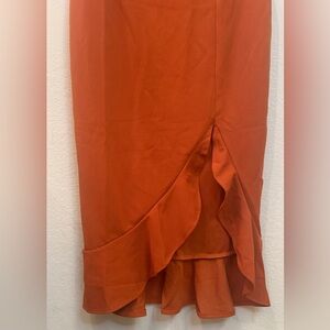 Step out in style in this Lyaner, elegant, orange off-shoulder dress. Slit up the side with a ruffle. 40” to hem. Never worn. I’m an 8 but a 36 DD and I felt it a bit too tight. It does have a good amount of stretch. Zipper is hidden. Perfect for any occasion, this dress offers a flattering fit and a chic design.