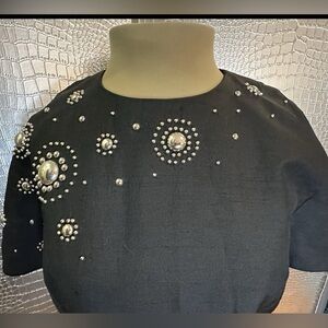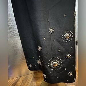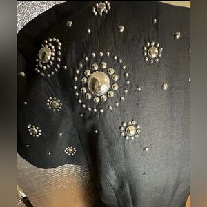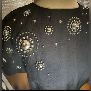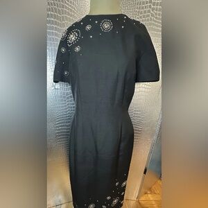 Very 50’s Mad Men chic sheath dress by Constance Warren for Richard Saunders. Black with silver tone starburst accents along the hem and neckline. Size 4. The 100% silk fabric has little to no give, so don’t expect it to stretch. It appears to be silk shantung, or a similar fabric, so irregularities in the fabric are part of the material, not defects. Fully lined. Overall, this is in good condition, but there are a few snags and pulls in the fabric. I’ve done my best to document them all but it’s possible some have been missed. Please examine photos carefully and message with questions. This is sold as is.