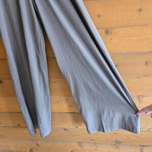 Lightweight wide leg pull on pant with a stretchy waistand. Zip pockets with a color match logo on the back. There are a couple faint spots on the front inner leg as shown, I have not tried to spot treat them. The fabric is so loose I did not notice them prior to photographing in natural sunlight.