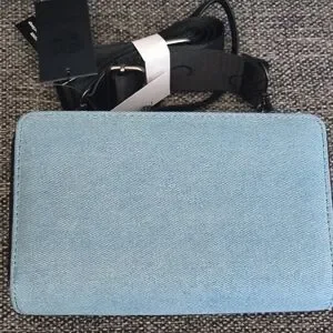 Stylish blue crossbody bag. Features vibrant floral embroidery. Includes adjustable black strap.