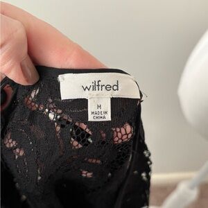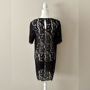 Elegant and timeless black lace shift dress from Wilfred. A beautiful sheer lace overlay with intricate floral pattern and scalloped hem makes this an effortless piece for events, evenings, or layering year-round. Classic silhouette with a relaxed, easy fit. Details • Size: M • Colour: Black • Short sleeves • Back keyhole closure • Sheer lace overlay with lining • Excellent condition Fabric Body: Rayon/Nylon/Cotton/Lyocell blend Trim: 100% Silk Measurements (approx, flat) • Bust: 19 in • Waist: 19 in • Hips: 20–21 in • Length: 34 in • Sleeve length: 9 in Relaxed shift fit. Can work for M or S depending on desired fit. Perfect little black dress with a romantic lace texture that never goes out of style.