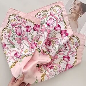 Pink Tulips & Floral with Chain Print Silky Scarf