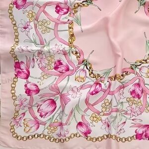 This floral scarf features a vibrant pink tulips with other flora design with gold chain. Perfect for any occasion. Measures flat approximately 27.5” square. This silky soft scarf is 100% Polyester. In new condition. NWT