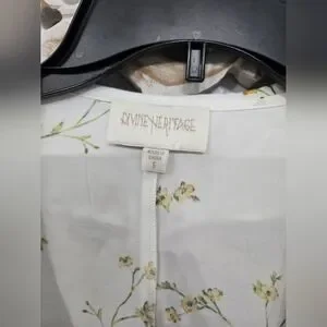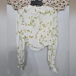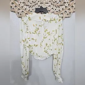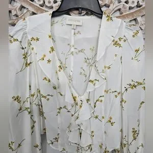 Elegant white blouse with delicate floral patterns and ruffle details. Perfect for a chic and stylish look. Size small. In excellent condition!