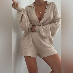 Romper from our free-est collection featured in a ribbed knit fabrication with exposed seaming and button-front detail in a super slouchy silhouette. Dropped dolman sleeves Front pocket detail Collar feature Pull-on style Perfect condition No longer sold Contents 48% Cotton 52% Linen