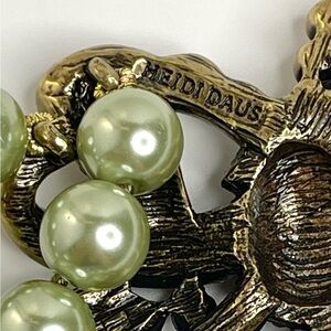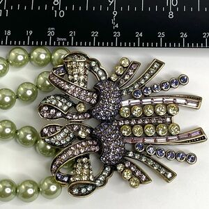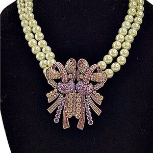 Heidi Daus statement necklace featuring two strands of sage/celadon green faux pearls and an oversized crystal rhinestone bow pendant in a pastel palette (lavender/purple, butter yellow, and mint tones). Glam, dramatic centerpiece with Heidi’s signature “diva” look—perfect for cocktail outfits, holidays, weddings, and dressy layering.