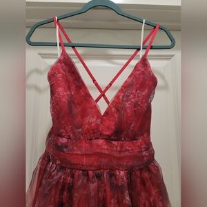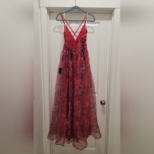 Size large. NWT. Lulus magenta floral print organza maxi dress with adjustable spaghetti straps into a fitted bodice with a plunging V-neckline and an open-back design. The full A-line skirt drapes effortlessly from the high, fitted waist to a maxi hem with a thigh-high side slit. Hidden back zipper/clasp.