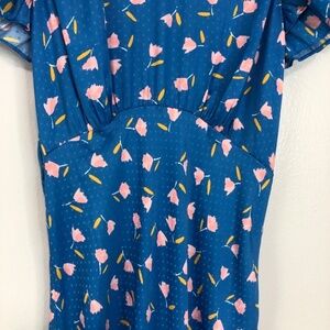 Saylor Jen reversible maxi dress in size XS, featuring a blue, pink, and yellow floral and polka dot print. From Revolve.