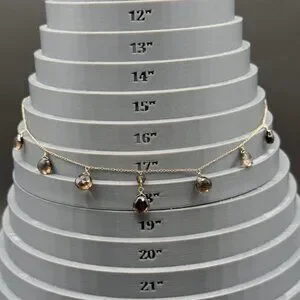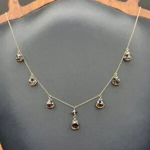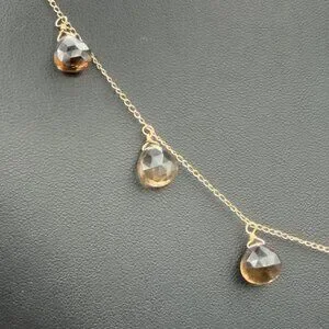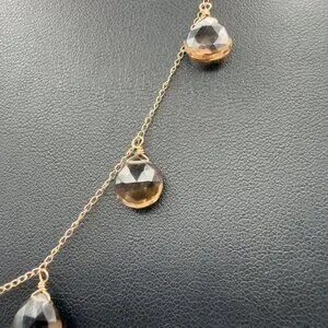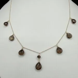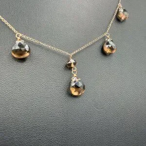 Elegant 14K yellow gold necklace featuring faceted smoky quartz pear-shaped drops. Perfect for adding a touch of sophistication to any outfit.