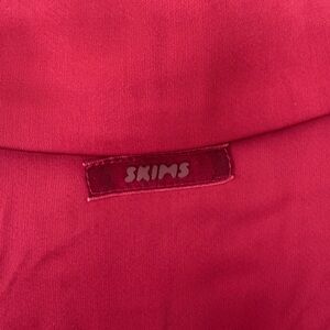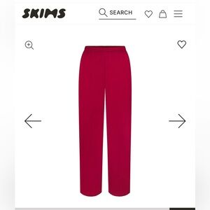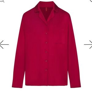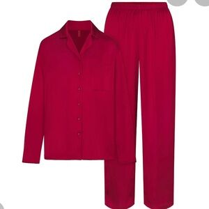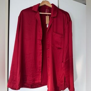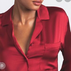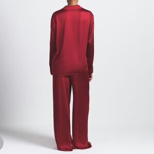 Luxurious red satin pajama set. Button-up top with long sleeves. Matching wide-leg pants. Perfect for a cozy night in.