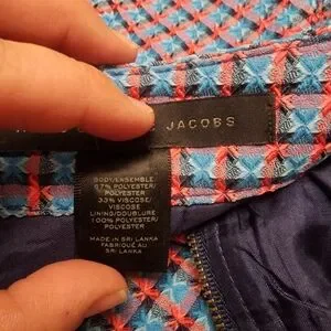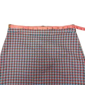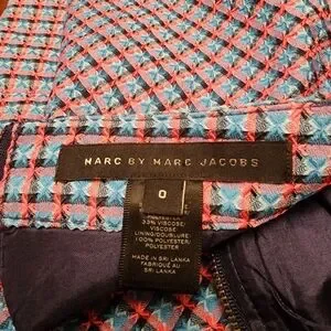 This chic mini skirt by Marc by Marc Jacobs features a sophisticated blue and coral color palette, perfect for both work and casual settings. Its tailored design and classic pencil style offer a sleek silhouette, making it a versatile addition to any wardrobe. In like new condition. Non stretchy polyester fabric blend. Zips up in the back. Lined underneath. The measurements are provided in the pictures.