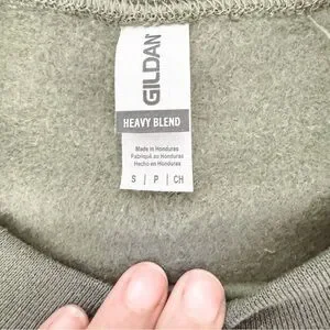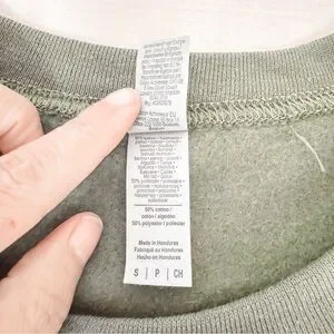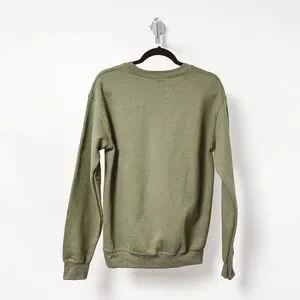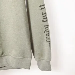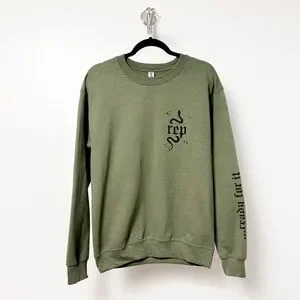Unisex sweat shirt. Military green in color. Crew neck. Long sleeves. Fleece inside. Snake design front. On one sleeve is "...ready for it" White font color. Never worn. Size Small