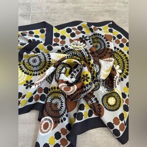 Lovely brand-new silk scarf! The color is described as "Cocoa Moss" and has a fun abstract circular pattern.