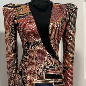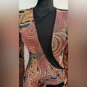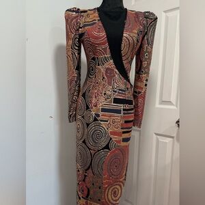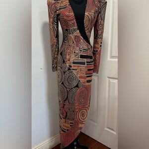 Unique! Embrace your artistic side with this stunning long sleeve dress. Featuring a captivating pattern in black, red, and gold, this dress is perfect for making a statement. Ideal for any occasion, it combines elegance with a unique flair.offers are welcome
