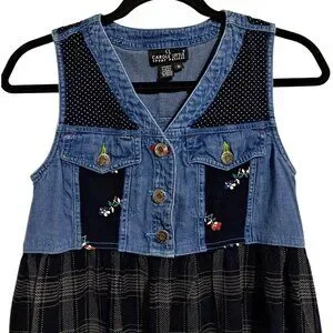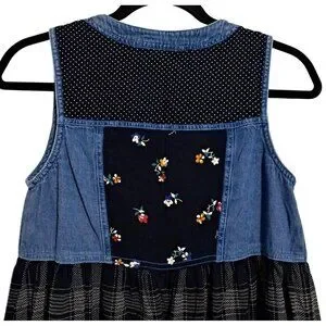 This modest jumper maxi dress combines denim accents with plaid and floral print for a timeless yet casual look. The sleeveless design offers comfort and versatility. In the last photo, you can see where the bottom hem on the back has been oddly, but securely, repaired. It is in otherwise great condition!