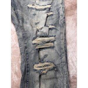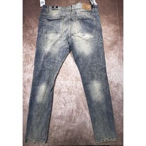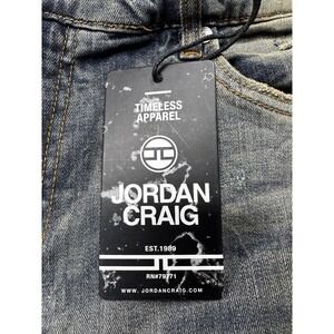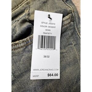 The product is a pair of Men JORDAN CRAIG Distressed Stretch Desert Gold Washed Denim Jean Pant in size 38x32. These skinny jeans feature a unique Desert Gold Blue color with a metal theme, crafted from denim fabric with added stretch for comfort. The brand Jordan Craig is known for offering high-quality and stylish denim clothing for men, making these pants a fashionable and versatile addition to any wardrobe.