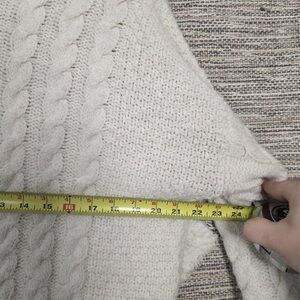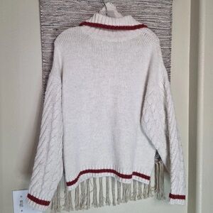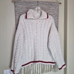 Elegant white cable knit with red accents. V-neck design. Perfect for layering.